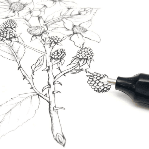 The Derwent battery-operated model will thoroughly erase the darkest graphite with ease. Still, you can also use it for pencil and charcoal edge cleanup, creating crisp, erased edges within tight areas and pulling out small detail highlights in graphite drawings. The operating button is comfortable and positioned on top of the eraser for fitting- and left-handed users—a favorite of artists of all levels.